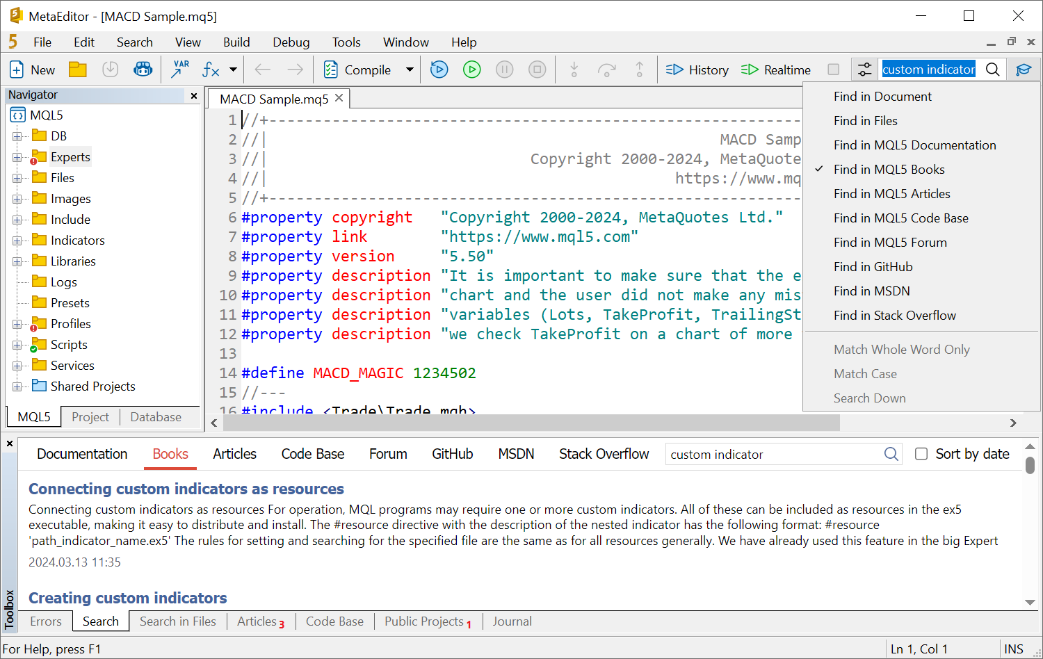 1. 添加对MQL5算法交易的神经网络一书内容的搜索。新选项与之前出版的交易者MQL5编程一书出现在同一部分。